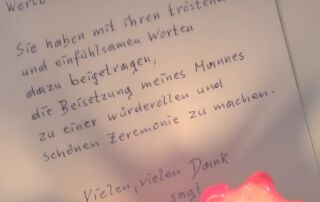 Mit diesen Zeilen möchte ich mich recht herzlich bei dir bedanken. Der Tod meiner geliebten Großmutter war für die ganze Familie ein Schock, und gerade die erste Zeit war geprägt von innerer Starre und Ohnmacht. Nicht nur, dass du eine wunderschöne Trauerrede hieltest, begleitetest du uns in unserer Trauer und unserem Schmerz.