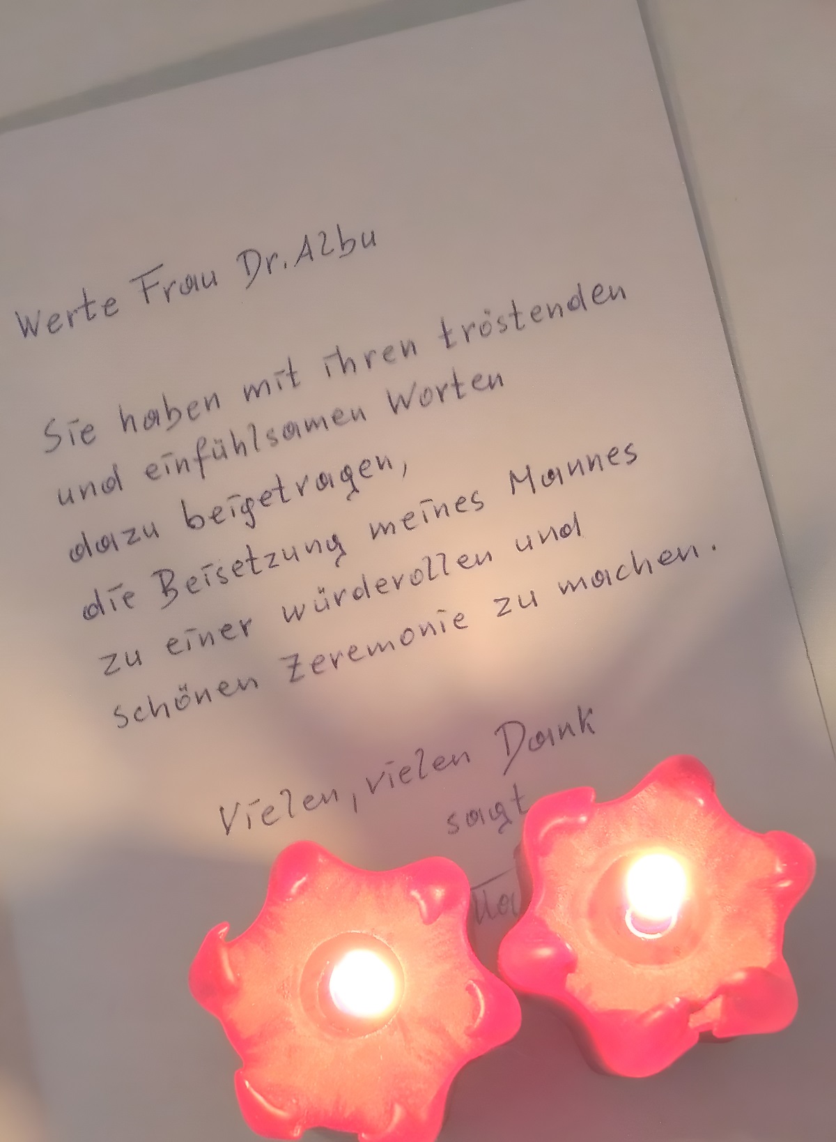 Ich danke Ihnen für Ihre wunderbare Begleitung, ihre tröstenden und perfekt ausgewählten Worte während der Trauerfeier! Sie haben uns Allen Trost und Hoffnung gespendet!